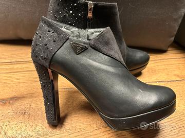 tronchetti donna neri, con zip laterale, eco pelle misto a scamosciato, con piccole pailettes su tacco, leggermente rovinata una punta