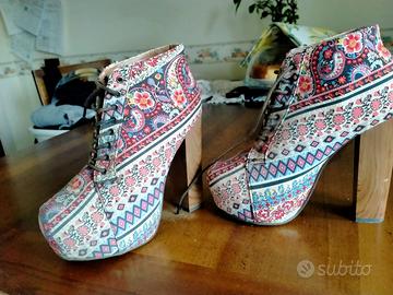 tronchetti fantasia, chiusura con spisoli, plateau, tacco color legno