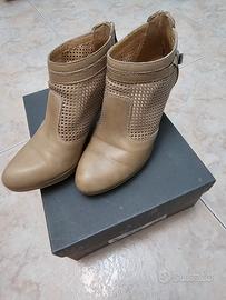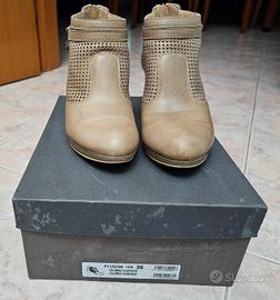 Tronchetti Nero Giardini in pelle traforati, colore champagne, logo in metallo NG, cerniera posteriore, misura 36, tacco cm.6.5, plateau cm 1, nella loro confezione originale