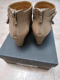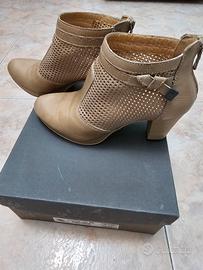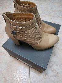 Tronchetti Nero Giardini in pelle traforati, colore champagne logo in metallo NG, cerniera posteriore, misura 36, tacco cm.6.5, plateau1 cm., nella loro confezione originale.