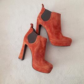 N° 40. Eleganti tronchetti in vera pelle scamosciata, con tacco largo (h cm 12) e plateau (h cm 2,5). Suola interna in vera pelle, elastico laterale. Come da foto, segnalo un piccolo segno sulla parte anteriore della scarpa sinistra. Per il resto sono in ottime condizioni. Marca Bagatt