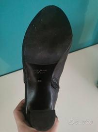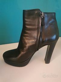 Vendo bellissimo tronchetto in pelle nera nr 39 Chantal, suola e tacco in gomma, tacco cm 11, 5 e plateau cm 2,5 in ottimo stato , h. Totale 22 cm.