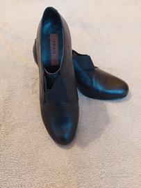 Tronchetto nero Frau realizzato in pelle morbidissima nera con elastico anteriore per favorire la calzata. Interno scarpa in pelle nera, sottopiede in pelle, fondo in gomma nero con tacco 6cm. Numero 39, lunghezza 25cm. Nuove. Scatola originale. Conservate in scatola.