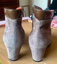 Tronchetto Katryn numero 38, vitello scamosciato con bordi in pelle lucida, lampo laterale, gamba sagomata che rende il modello piacevole anche sotto un vestito