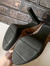 Le scarpe sono state impiegate per una sfilata di moda e mai più indossate. Come si vede dalle foto le calzature sono ancora in ottime condizioni: la tomaia si presenta priva di graffi. Soletta e tacco in ottimo stato. Suola priva di abrasioni.