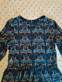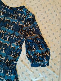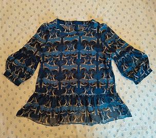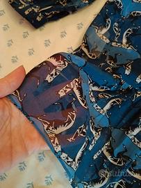 Blusa in tessuto tipo voile / chiffon del marchio Trussardi linea Trussardi Jeans. Modello con balza sul fondo e maniche ¾ con particolare effetto “a sbuffo” sul fondo. Il lato con i bottoncini va sulla schiena …tessuto leggero blu indigo con la tipica stampa di levrieri, simbolo del marchio. Leggera trasparenza. Taglia indicata XL (penso possa andare anche a una L, chiedete pure le misure)