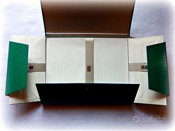 * RISPONDO SOLO ad UTENTI ISCRITTI A SUBITO E CON PIU' ANNUNCI ATTIVI.* * NON VALUTO le sciocchezze delle 'PROPOSTE D'ACQUISTO'. TRUSSARDI Scribe VINTAGE 1987 LOTTO *IN-DI-VI-SI-BI-LE* di 2 (DICONSI DUE) OGGETTI: 🐍 CARTA DA LETTERE in ELEGANTE CARTELLINA + 🐍 QUADERNO pagine colorate e decorate Cartellina rigida in PLASTICA, STAMPA effetto PITONATO con carta da lettere. Nella stessa fantasia pitonata, QUADERNO con pagine AZZURRE! By TRUSSARDI, ANNI ’80, NUOVI DA NEGOZIO. 🐍 CARTELLINA Folder IN CARTONE rigido, lucido esternamente, a lavorazione PITONATA, foderato. DA APRIRE CON DELICATEZZA. Ha 3 alette interne, con 20 BUSTE e 20 FOGLI. CARTELLINA chiusa: 31,5 x 25,5 x 1,5 cm. FOGLIO A4: 29 x 21 cm. BUSTA: 9 x 11 cm. PESO: 616 gr. MATERIALE: Plastica e cartone + carta 🐍 QUADERNO QUADERNO formato ‘piccolo’ (A5), con cover STAMPA effetto PITONATO e PAGINE COLORATE CELESTI e con il LOGO Trussardi. Copertina BIANCA con lavorazione PITONATA. QUADERNO A5: 20,5 x 14,5 cm. PAGINE: 28 (x2) + 1 – righe + margine PESO: 135 gr. MATERIALE: Cover lucida e con decorazione a rilievo. 🐍 CONDIZIONI Oggetti NUOVI DA NEGOZIO, COMPLETI, PERFETTAMENTE PULITI, IMPECCABILMENTE CONSERVATI. *NON TRATTO E NON HO MAI TRATTATOUSATO!* CARTELLINA: OTTIME CONDIZIONI. Qualche segno davvero minimo all’interno e ai lati. Una SBUCCIATURA di 2 mm in corrispondenza del PUSUAR. FOGLI E BUSTE PERFETTE condizioni. La parte preincollata delle buste NON è attaccata a se stessa. Leggerissimi avvallamenti in alcune buste. La cartellina può essere utilizzata come un elegantissimo PORTADOCUMENTI. QUADERNO OTTIME CONDIZIONI. Qualche segno davvero minimo di INGIALLIMENTO e qualche PUNTINO solo sul lato inferiore e destro della cover. NON VI SONO DATAZIONI, ma basta cercare il marchio TRUSSARDI SCRIBE per trovare una datazione sicura (pubblicità in una rivista del 1987). © TRUSSARDI SCRIBE Sul quaderno anche: © CARTOMODA – Italian Style - SPEDISCO solo con POSTE DELIVERY STANDARD.