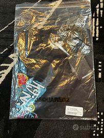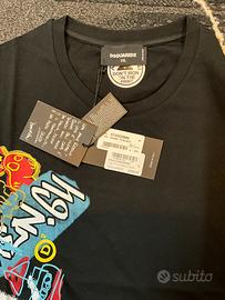 T-shirt originale DSQUARED2, colore nero, modello a girocollo con stampa grafica verticale in stile graffiti/street art.
