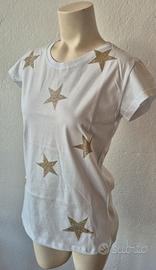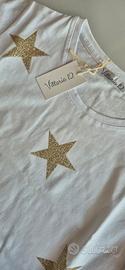 T-shirt in cotone bianca con stampa stelle glitter oro. Lunghezza cm 65 Petto cm 44 Spalle cm 38 Taglia S/M Made in Italy Vittoria12