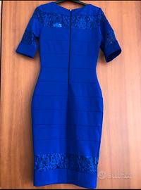 Tubino aderente colore blu elettrico, non liscio, ma strutturato a righe. Maniche corte con inserto in pizzo, pure sulla scollatura è nella parte finale della gonna.