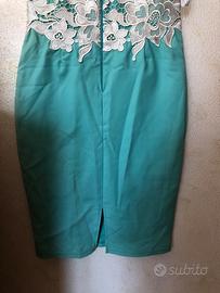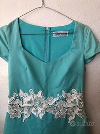 Tubino a maniche corte, colore verde turchese chiaro con ricamo floreale bianco sotto il busto. chiusura con zip dietro lungo la schiena. Piccolo spacco nella gonna dietro. Marca Paper Dolls. taglia: UK 8 EU 36 S. usato, ma in buone condizioni.