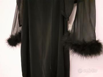Elegante tubino da sera nero Le Group Woman, perfetto per serate e occasioni speciali, accompagnato da un raffinato coprispalle in tessuto morbido e trasparente con bordature in piume.