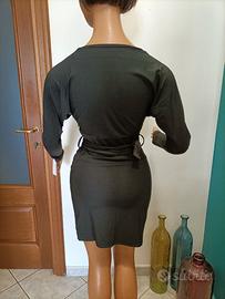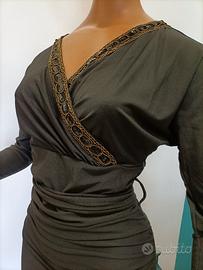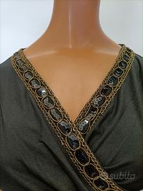 Tubino scollo a V incrociato con decorazione e paillettes nere, cintura in vita, zip laterale, drappeggiato sui fianchi, colore nero. Composizione: 95% Poliestere - 5% Elastane. Taglia unica ma veste una S. Video articolo e altri articoli disponibili sul profilo facebook 2EFFEMOD