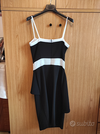 Tubino nero con dettagli bianchi e drappeggio sul davanti.