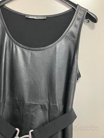 Tubino nero in morbidissima pelle davanti, viscosa e rayon dietro, di Pianura Studio, taglia 42. Sul davanti ha un taglio sotto il seno e, tutto intorno, una cintura in tessuto con fibbia in metallo argentato. Le condizioni sono molto buone, la vestibilità elegante. La lunghezza dell'abito è 97cm