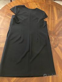 Grazioso tubino nero con tasche e apertura sul dietro con zip. Tessuto un po’ elasticizzato. Scollatura squadrata. Lungo al ginocchio. Veste tg 50.