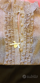 tubino nero lucido con spacco posteriore e profondo scollo davanti e manichine di un tenero tessuto a fiorellini pastello con bottoncini e galette sullo scollo. da etichetta taglia L.