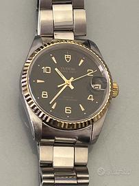 Tudor 72033 quadrante nero ed indici in oro . Molto bello e ben tenuto . Movimento perfetto . Bracciale non originale ma con fibbia loggata Rolex . Misura polso bracciale per uomo . Cassa 33 mm ovvero medio adatto a polsi eleganti da uomo e donna .