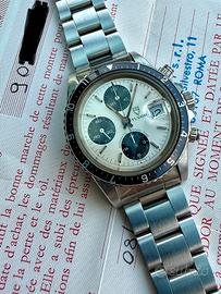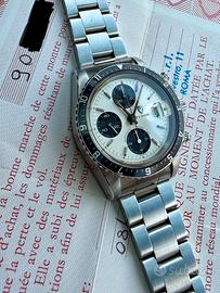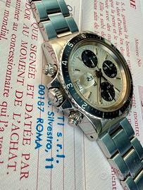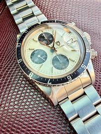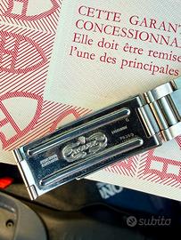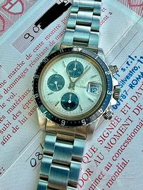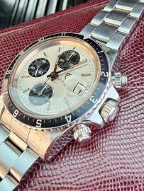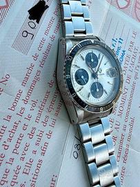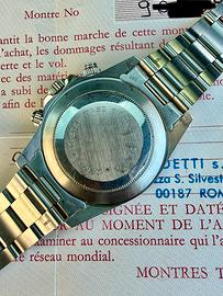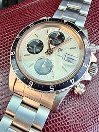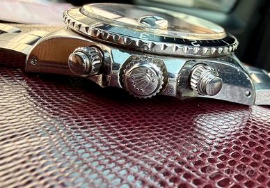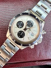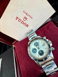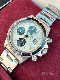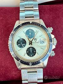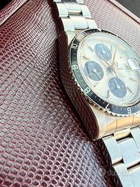 Orologio full set ref 94210 Condizioni pari al nuovo Orologio con quadrante molto raro. Sotto la scritta "Tudor", dove normalmente si troverebbe il testo "oysterdate", non c'è nulla. Questa caratteristica del quadrante, riconosciuta come la prima esecuzione ,estremamente rara. I cronografi Rolex "Solo Dial", poco comuni ma conosciuti, sono spesso visti e venduti solo nelle aste più importanti. Il fatto che esistano solo pochi Tudor Big Block "solo dial", rende questo pezzo specifico un esempio molto ambito dalla comunità dei collezionisti. Il quadrante originale "solo" argentato con sub-quadranti neri è in condizioni bellissime, praticamente impeccabili, e non presenta danni o segni di età. Le macchie di lume al trizio hanno raggiunto una sottile, ma affascinante patina color guscio d'uovo e non mostrano alcun degrado se ispezionate sotto la luce UV. Le lancette originali al trizio si abbinano perfettamente al quadrante