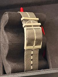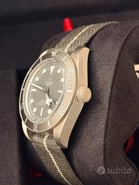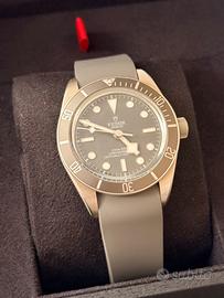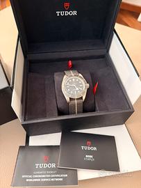Cassa in argento, 39 mm Cinturino in tessuto color tortora Scatola e libretti no garanzia Garanzia di cinque anni Cassa in argento 925, 39 mm, finitura satinata Fondello trasparente con vetro zaffiro Calibro di Manifattura MT5400 (COSC) Movimento meccanico a carica automatica con rotore bidirezionale Autonomia di circa 70 ore Corona di carica a vite in argento 925, con la rosa TUDOR in rilievo e con tubo della corona in argento 925 satinato con lavorazione circolare Impermeabile fino a 200 m Lunetta girevole unidirezionale in argento 925 con disco graduato 60 minuti in alluminio anodizzato color tortora opaco e indici e numeri in argento dorato Color tortora, bombato Vetro zaffiro bombato Cinturino in tessuto color tortora con fibbia