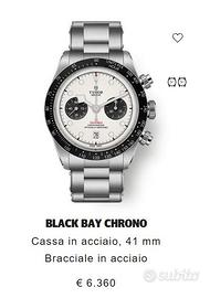 CRONOGRAFO TUDOR Referenza: M79360N-0012 DIAL PANDA Garanzia di cinque anni in corso (dal 4/2023), trasferibile, senza registrazione né revisioni obbligatorie Cassa in acciaio, 41 mm, finitura lucida e satinata Anse: 22 mm di larghezza Spessore della cassa: 14.4 mm Movimento Calibro di Manifattura MT5813 (COSC) con funzione cronografo Movimento cronografo meccanico a carica automatica con rotore bidirezionale Autonomia di circa 70 ore Corona di carica a vite in acciaio con la rosa TUDOR in rilievo Pulsanti a vite in acciaio a ore 2 e 4 impermeabile fino a 200 metri Lunetta fissa in acciaio con disco in alluminio anodizzato nero opaco, scala tachimetrica e graduazioni argentate Opalino con contatori neri, bombato Datario a ore 6 Vetro zaffiro bombato Bracciale rivettato a tre maglie in acciaio, finitura lucida e satinata, chiusura TUDOR “T‑fit” con sistema di regolazione rapida CONDIZIONI PARI AL NUOVO FULL SET ASTENERSI PERDITEMPO VALUTO PERMUTA CON PANERAI MANUALI 44MM 001/002 / LOGHETTO ECC. (ALTRE REFERENZE DA VALUTARE - TIPO SUBMERSIBLE) SOLO CON SECONDINA E QUADRANTE NERO/BLU E SOLO SE FULL SET CON DIFFERENZA A MIO FAVORE DA STABILIRE (VALORE PERMUTA A LISTINO) - oppure PERMUTA CON DJ ROLEX 16220/16234/16013/16264 ANNI 2000 FULL SET QUADRANTI SCURI BLU/GRIGIO/NERO PAGAMENTO SOLO CONTANTI O BONIFICO ISTANTANEO NO PAYPAL NO TUTTOSUBITO NO ALTRI SISTEMI RITIRO PRESSO LUOGO SICURO VIDEOSORVEGLIATO IN MILANO EVENTUALE SPEDIZIONE A VOSTRA CURA E SPESE E RESPONSABILITA' EVITATE OFFERTE AL RIBASSO, PREZZO FINITO VISTE CONDIZIONI E CORREDO POSSIBILE AVERE OLTRE AL BRACCIALE ANCHE UN CINTURINO TUDOR ORIGINALE CON DEPLOYANTE ACCIAIO ACQUISTATO A PARTE, AL COSTO AGGIUNTIVO DI 200 EURO. GUARDA ALTRI MIEI ANNUNCI E FEEDBACK