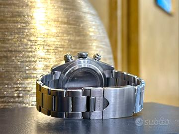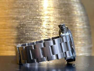 La cassa in acciaio da 41mm, impermeabile fino a 200 metri, ospita un quadrante nero opaco con contatori a contrasto e datario a ore 6, protetto da vetro zaffiro bombato.