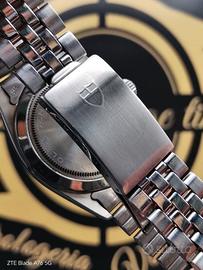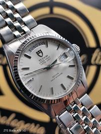 Tudor Oyster Prince Date+Day ref. 94614classico orologio vintage (principalmente degli anni '80 e primi '90) che offre l'estetica dell'iconico Rolex Day-Date Cassa: 35,5 mm in acciaio inossidabile. Lunetta: Zigrinata (fluted) inoro bianco 18k. Movimento: Meccanico a carica automatica tudor basato sul calibroETA Vetro: Vetro acrilico (Plexiglas) con lente d'ingrandimento Cyclope sul datario. Funzioni: Indicazione del giorno della settimana a ore 12 e data a ore 3. Bracciale: bracciale Jubilee terminali 596 Cassa Oyster: "Original Rolex Design" sul fondello. Corona: Corona di carica a vite con il logo della corona Rolex. Quadrante ,argento (Silver) COMPLETAMENTE REVIONATO VIENE SPEDITO CON SPEDIZIONE ASSICURATA