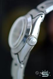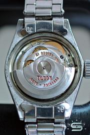 Tudor Oyster Princess 7575 dei primi anni 60. Si identifica con una referenza Tudor 7575. Questo orologio è contraddistinto da una cassa in acciaio da 22 mm. esclusa corona ed anse. Lo spessore è di 10 mm. compreso il vetro. Il quadrante argentato ha indici applicati e sfere douphine. Al 12 campeggia ancora il vecchio Logo con la rosellina. È protetto da un vetro acrilico nuovo. Ad incorniciarlo c’è una lunetta liscia. La corona di carica è originale, marchiata Rolex e serrata a vite. Al suo interna batte un movimento meccanico a carica automatica su base Eta 2556. Anche il fondello è serrato a vite e presenta le specifiche dettate dal produttore, in questo caso Rolex. Ad assicurarlo al polso c’è il suo bracciale originale, anch’esso marchiato Rolex con ribattini. Quest’ultimo gode inoltre di maglie elastiche. In considerazione dei suoi 60 anni di età, l’orologio si presenta in ottime condizioni sia meccaniche che estetiche. È privo di scatola e documenti originali. ‼️NON SONO INTERESSATO A OFFERTE INFERIORI AL PREZZO INDICATO O A SCAMBI. GRAZIE.‼️ ‼️GUARDA TUTTI I MIEI OROLOGI IN VENDITA!‼️