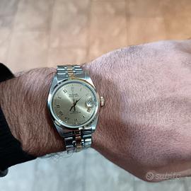 Cassa in acciaio con lunetta liscia aftermarket, diametro 32 mm, vetro zaffiro, quadrante champagne con numeri romani applicati, data a ore 3 con lente di ingrandimento. Movimento automatico self-winding (base ETA), fondello a vite. Bracciale bicolore acciaio/oro stile Jubilee.