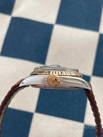 Orologio acciaio ed oro da donna, magnificamente conservato, ancora con il cinturino in pelle oroginale usato pochissimo, ovviamente completo di fibbia logata! Movimento automatico ETA 2671 con scatto rapido della data, perfettamente funzionante. Cassa oyster in acciaio diametro 25mm esclusa la corona, perfetta! Vetro plexy senza un graffio. Corona di carica e ghiera in oro, magnifico quadrante color oro, così come sfere ed indici.