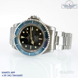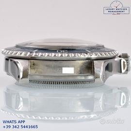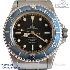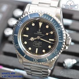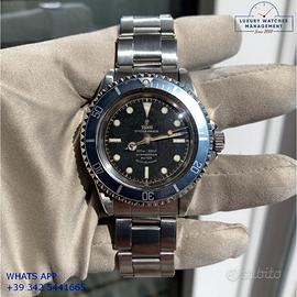 Tudor Submariner 7928 Rosellina acciaio, anno di produzione 1965, ghiera bidirezionale in acciaio con inserto in alluminio colore blue virato a scala graduata, vetro plastica bombato, quadrante opaco colore nero grafica gilt con indici e sfere al trizio, movimento meccanico a carica automatica, bracciale Oyster in acciaio a rivetti con chiusura deployante originale Rolex.