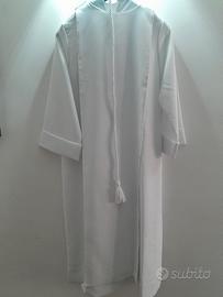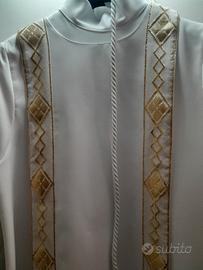 Splendida tunica per Prima Comunione (modello Tarcisiana), indossata solo una volta per la cerimonia e lavata professionalmente in lavanderia. L'abito è in condizioni perfette, pari al nuovo. - Modello: Classico a tunica bianca con bande verticali decorate. - Decorazioni: Ricami geometrici dorati di alta qualità lungo le bande anteriori, che donano luce ed eleganza al capo. - Accessori inclusi: Completo di cordoncin bianco (cingolo) con nappa finale. - Misure: Lunghezza totale di 115 cm (misurata dalla spalla al bordo inferiore). - Caratteristiche: Tessuto leggero, non trasparente, resistente alle pieghe e molto confortevole da indossare.