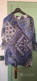 Elegante blusa da donna con una fantasia vivace sui toni del blu e multicolore. Il tessuto leggero e la stampa la rendono un capo versatile.