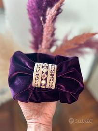 Perfetta per la stagione fredda, protegge e riscalda anche le orecchie. Il corpo della fascia è in velluto viola (Elasticizzata), impreziosito da ricami di un rosso intenso e decorazioni con specchietti incastonati. Materiali: velluto, cotone e specchietti.