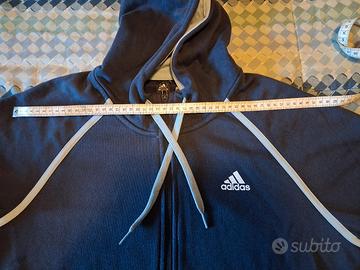 tuta garzata blu, marchio Adidas, con inserti e interno cappuccio celesti, taglia M. misure felpa spalle cm 45,ascelle 54,lunghezza 70, pantalone vita cm 36,lunghezza 100. Ideale per la primavera.