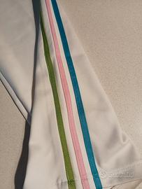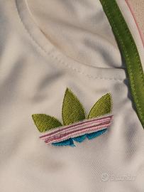 Tuta Adidas Vintage bianca con bande verde rosa celeste come da foto, taglia M, come nuova usata pochissimo causa taglia non proprio azzeccata (ha i suoi anni ma sempre stata in armadio e pochissime volte indossata)