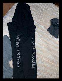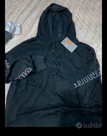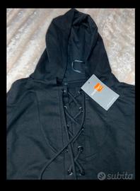 Mai indossata,una tuta composta di una Felpa nera di cotone, con cappuccio r modello carino con corde sul petto,la felpa ha scrittura bianca sulle maniche.