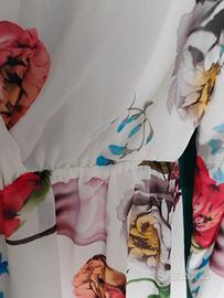Deliziosa tuta donna corta in leggero e morbido tessuto poliestere a fiori su fondo bianco ,maniche lunghe con elastico al polso , scollatura incrociata profonda , foderata sia sul davanti che nella parte del pantaloncino , ideale per le serate d'estate quando si vuole indossare un capo elegante ma allo stesso tempo spiritoso ( basta indossare delle sneaker ) oppure con infradito gioiello . Condizioni ottime , un po' la fodera del pantaloncino smagliata , veste una 42/44 italiana .