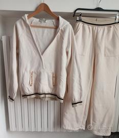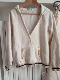 Chándal on tuta sportiva per il tempo libero, color crema, con profili a righe scure nere e dettagli color oro sulle tasche. Marca KLN. In cotone elasticizzato. Taglia S. In perfette condizioni.