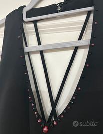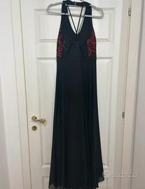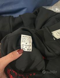 Tuta da cerimonia con schiena incrociata, velo sul pantalone fatto di pizzo e dettagli in rosso. Corpetto con incluse coppette e con perline. Unico difetto una perlina mancante. Marchio Vivaldi, taglia 52. 100% poliestere Giro seno circa 50 cm, da ascella a ascella circa 53 cm. Indossato nell'ultima foto