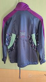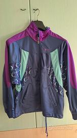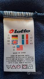Tuta da ginnastica Lotto, da donna, colore blu/viola con inserti verde chiaro e ciclamino. Comprende una giacca aperta con cerniera e tasche laterali e pantalone tinta unita con tasche. Usata poche volte. Taglia 42