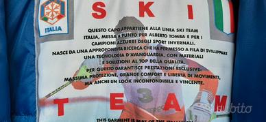Il capo appartiene alla linea Ski Team Italia, Creato per Alberto Tomba e gli azzurri dello sci degli anni 90. Giacca in perfette condizioni, pantaloni con piccoli segni di usura a livello del cavallo e della seduta. Giacca con chiusura zip e bottoni, polsini con velcro,cappuccio richiedibile all interno del colletto.Per altre informazioni e / o foto non esitate a contattarmi.