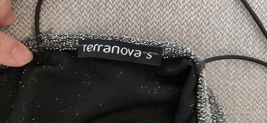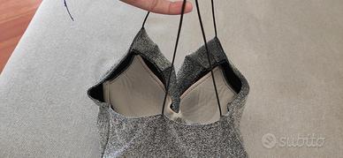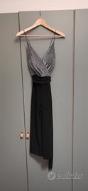 Tuta estiva da sera, nera e argento, con spalline sottili incrociate sulla schiena e cintura di tessuto in vita.