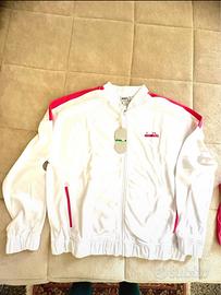 Tuta Diadora con pantaloni fucsia e giacca con cerniera bianca e profili fucsia. Nuova con cartellino.