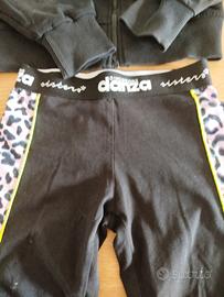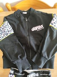 Tuta completa della Dimensione Danza per essere sportiva e fashion allo stesso tempo, bellissima inserti viola animalier e retina trasparente al fondo dei pantaloni. Felpa con comoda zip e due taschine. 7 anni 122 cm