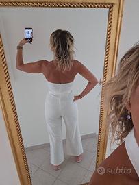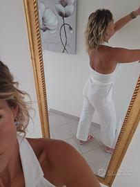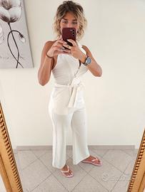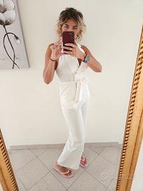Tuta donna Cider, Nuova etichettata, modello estivo a pantalone, tessuto elasticizzato e chiusura a zip su retro, pantaloni a Palazzo e cintura in stoffa abbinata, ampie tasche su parte frontale e ampio scollo a V su petto, ottimo vestibilità e rifiniture, colore bianco, Tg XS