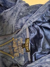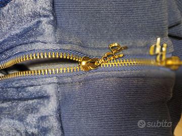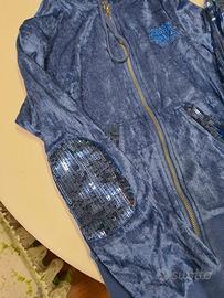 Tuta donna con cappuccio in viscosa e poliestere con effetto ciniglia. Inserti di pailettes sulle toppe del gomito ,lungo il pantalone e sulle tasche. Taglia III (42)