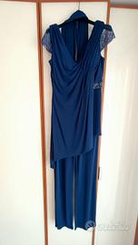 Tuta donna molto elegante usata come testimone di matrimonio. tessuto elasticizzato molto morbido (usata in gravidanza circa al quinto /sesto mese). Strass sul fianco sinistro molto raffinati e voulant davanti che scende libero (un po' voluto per non dare nell'occhio il pancione). Abito creato in atelier su misura. Io vesto una taglia M - 44. Acquistato appositamente in tessuto morbido per rimanere in comfort per tutta la giornata di cerimonia.