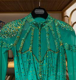 Tuta elasticizzata in lycra colore verde smeraldo da gara con Swarovski in cristal.