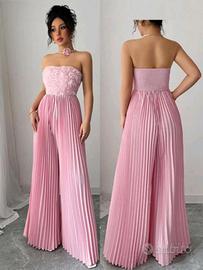Vendo tuta rosa elegante plissettata a decolté con rose in tulle TAGLIA : XL (vestibilità comoda fino ad una tg 50) NUOVA